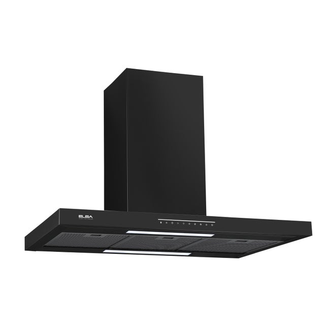 Island chimney design with variable extraction rates and quiet motor technology for open-plan kitchens.