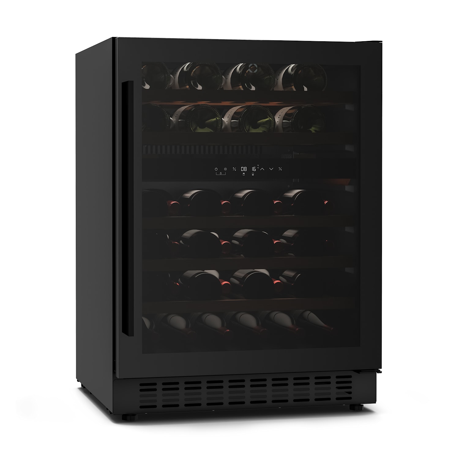 Dual-zone temperature control, UV-protective glass, low-vibration compressor for premium wine storage.